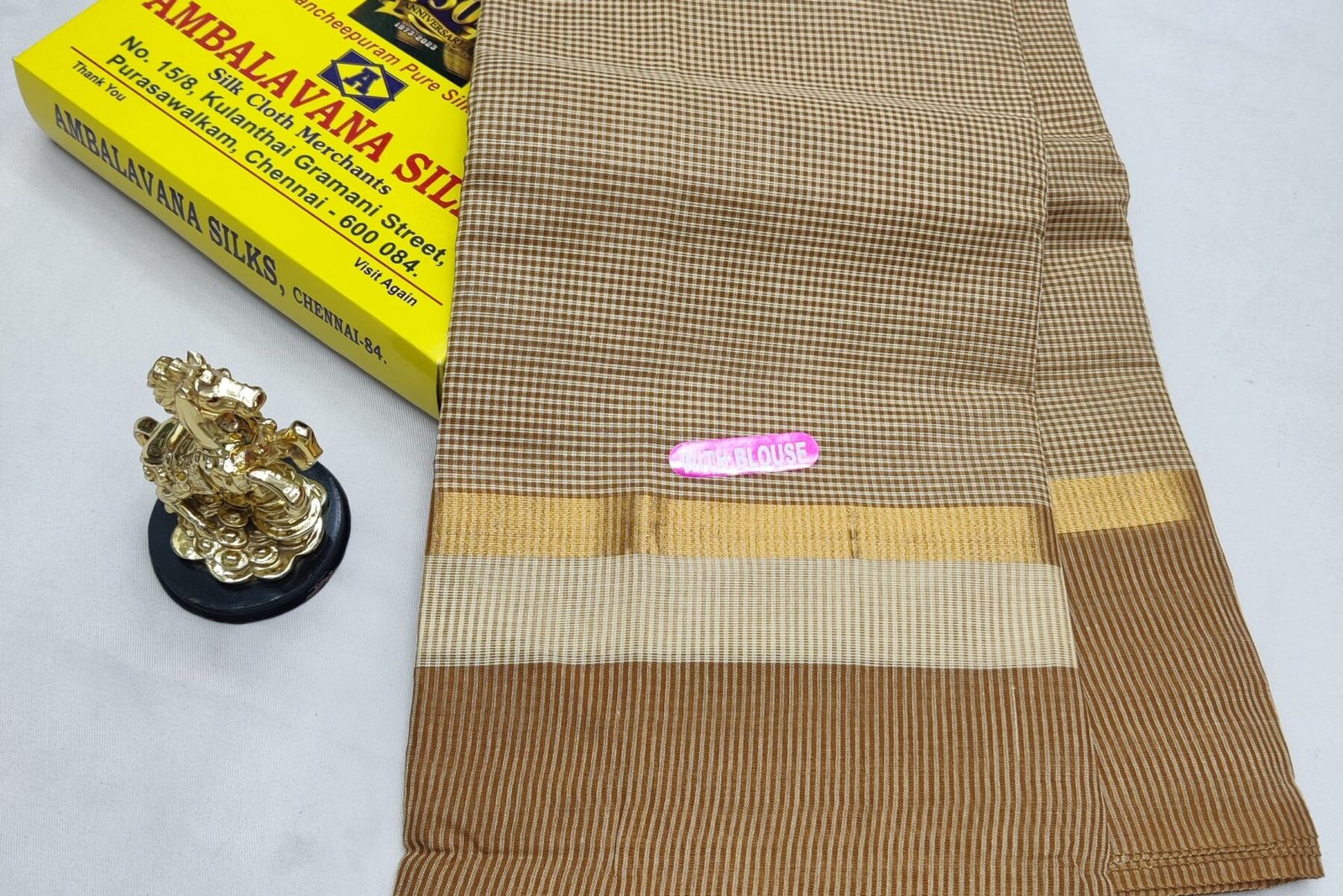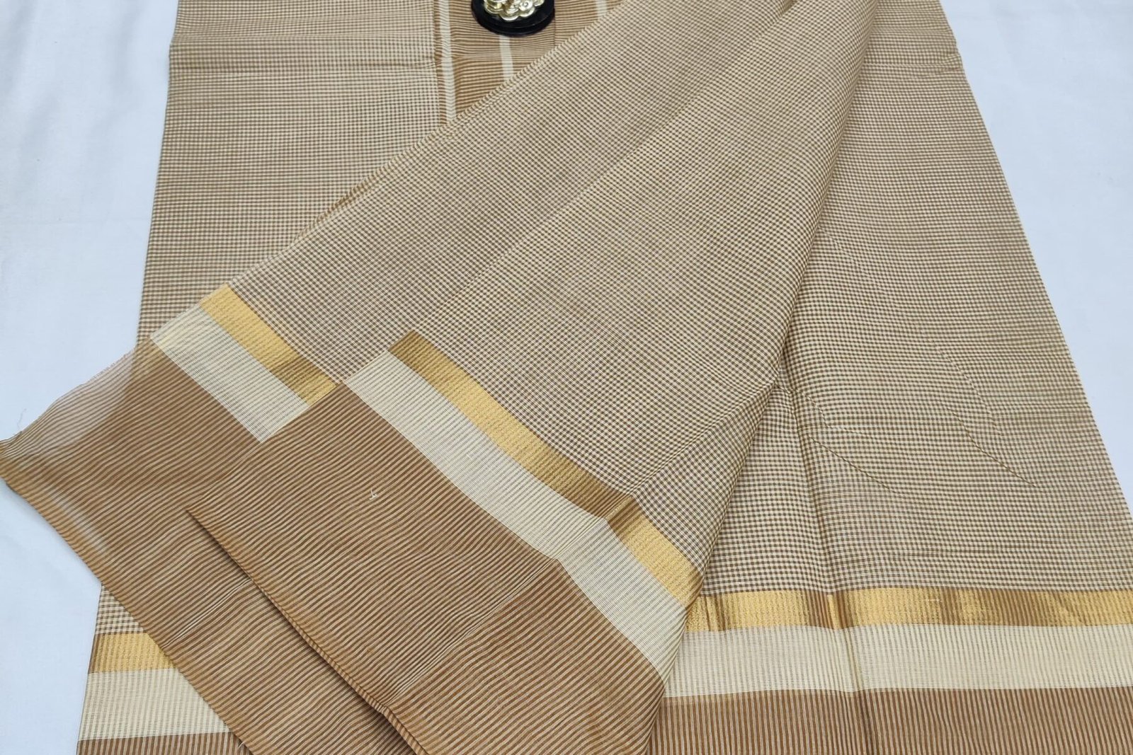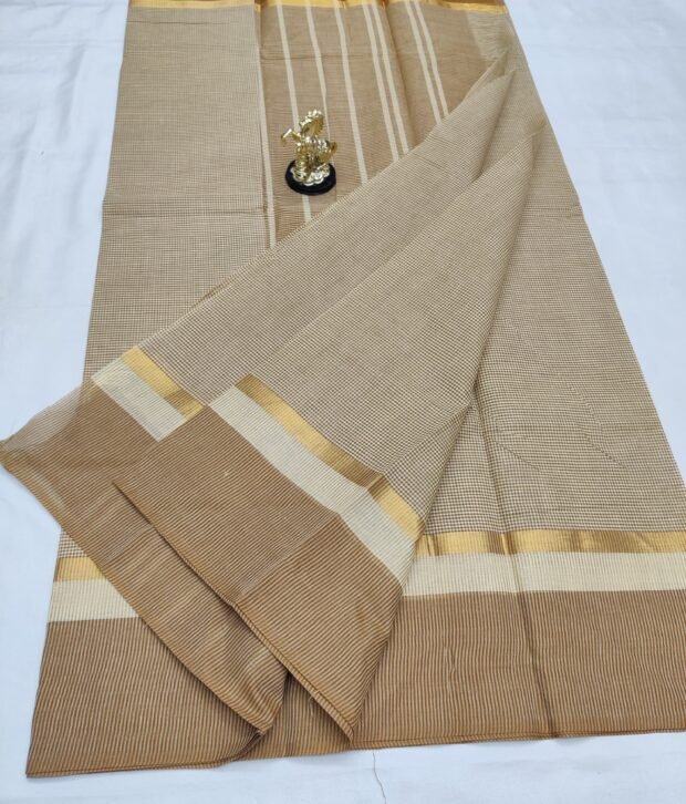 Discover the elegance of Andhra Pradesh’s traditional handwoven cotton sarees, featuring a subtle mini checks pattern that adds a touch of sophistication to your everyday look. Each saree is crafted with care, offering a small jari border for a hint of shine and a running blouse piece that matches seamlessly. Lightweight and breathable, these sarees are perfect for daily wear, combining comfort with timeless style.
