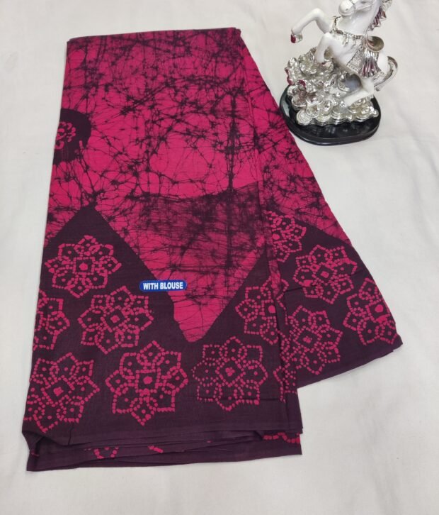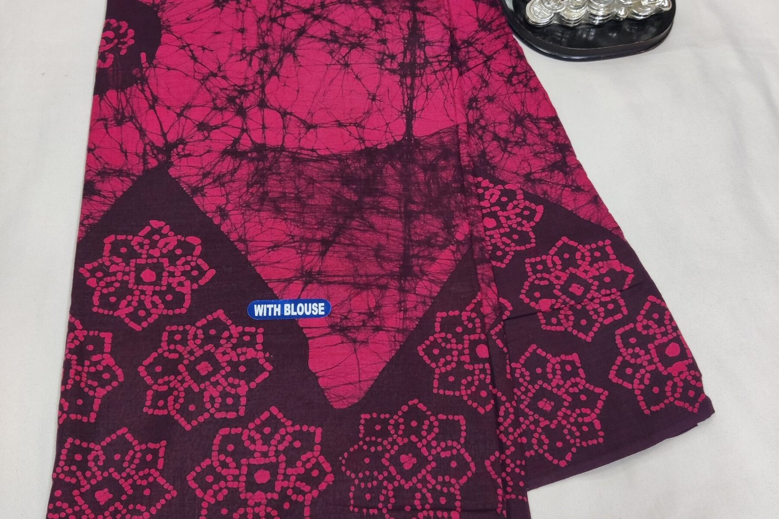Discover elegance redefined with our stunning sarees, featuring an enchanting pluse design paired with vibrant color combinations that make a bold statement. Meticulously crafted from pure cotton batik, these sarees offer a perfect mix of comfort and sophistication.