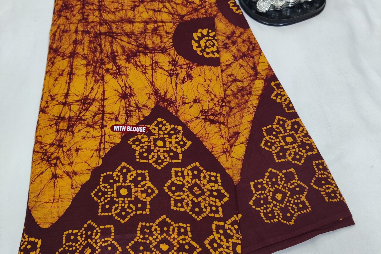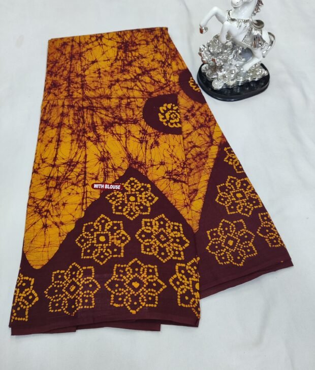 Discover elegance redefined with our stunning sarees, featuring an enchanting pluse design paired with vibrant color combinations that make a bold statement. Meticulously crafted from pure cotton batik, these sarees offer a perfect mix of comfort and sophistication.