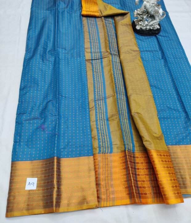 Eaturing a beautiful pluse design, these sarees showcase inspiring color combinations that enhance their charm. The sarees are finished with an intricately designed jari border and a rich pallo, adding sophistication and grace. Each saree comes with a contrasting blouse piece, offering a striking visual appeal that perfectly complements the saree’s elegant design.