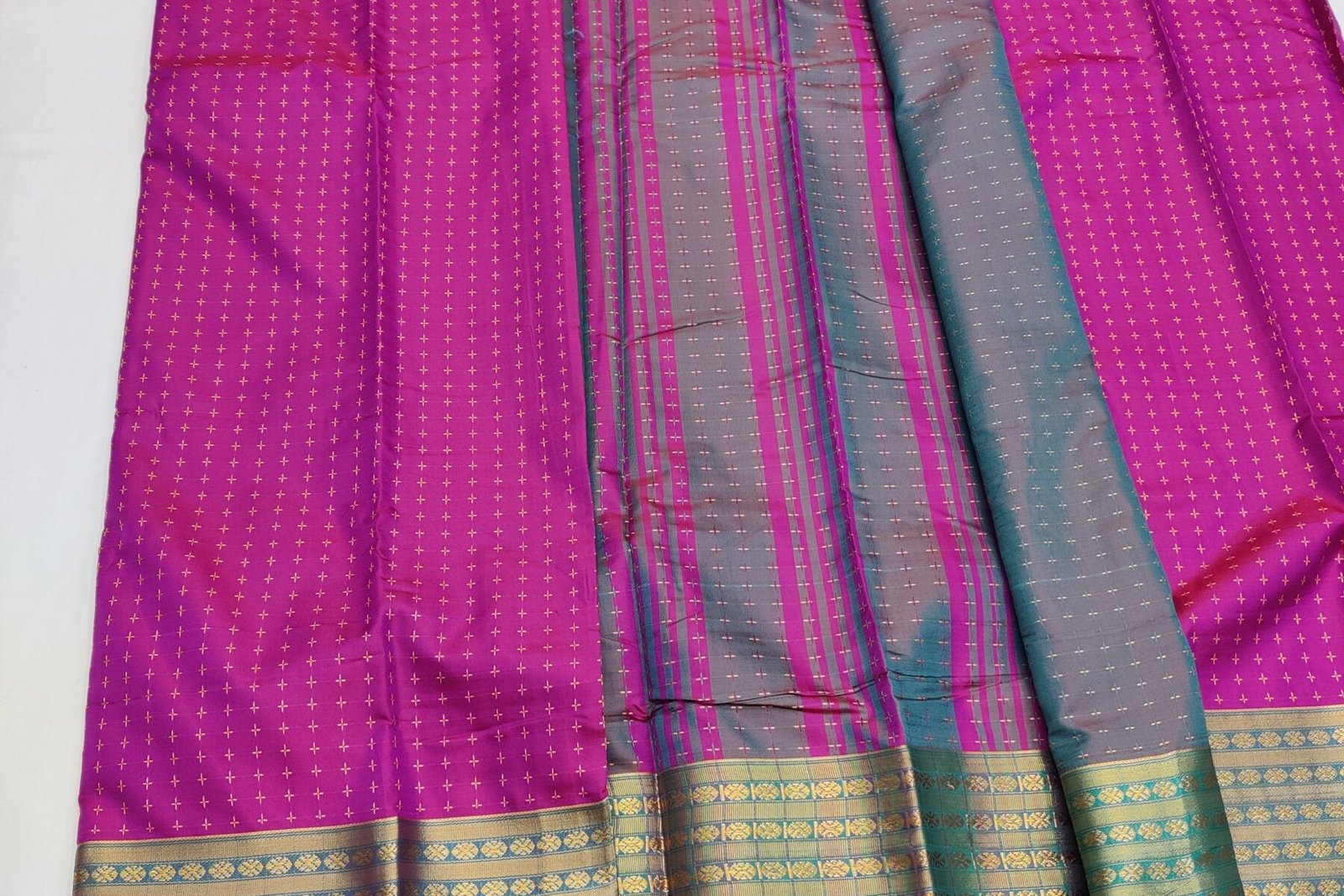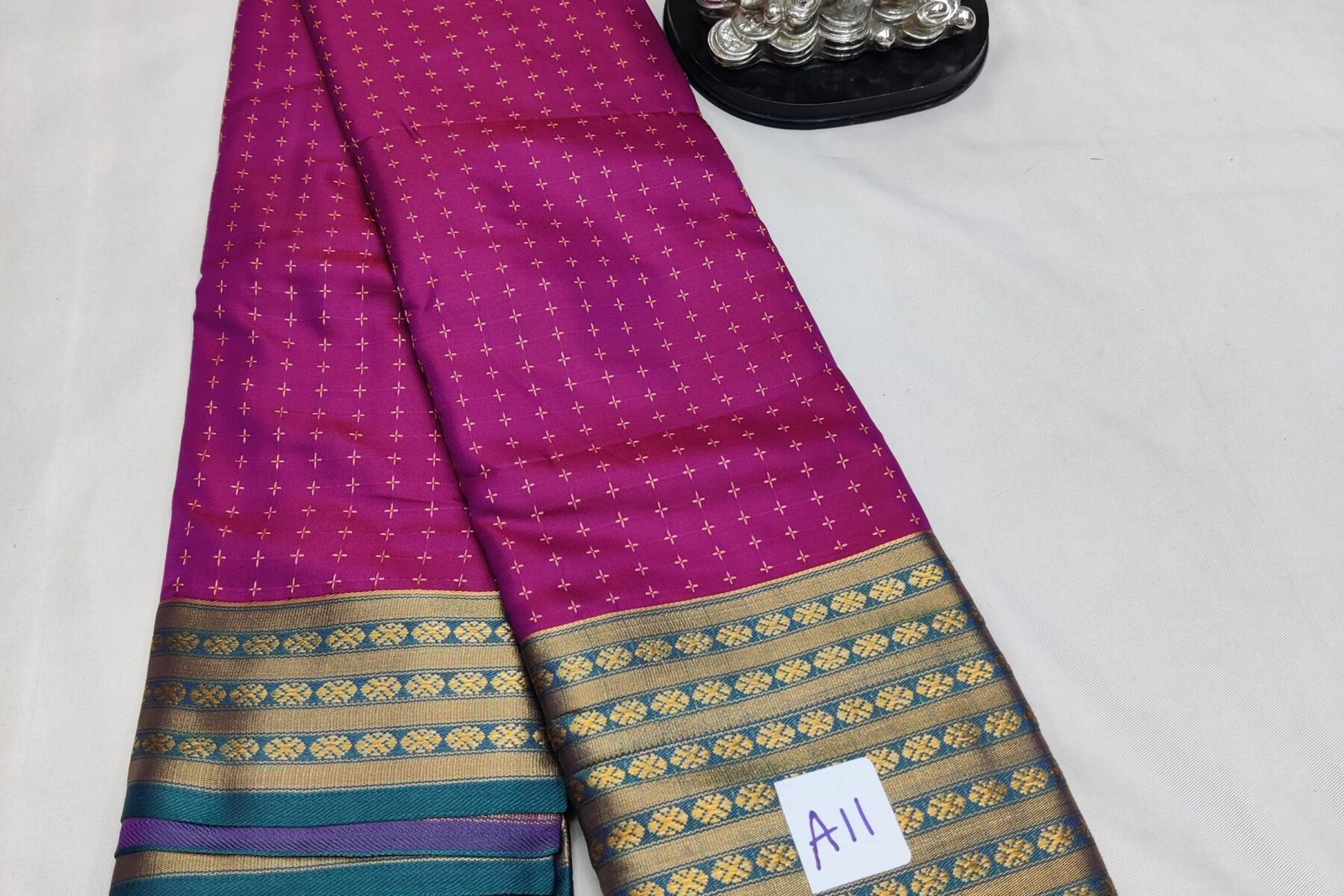 Eaturing a beautiful pluse design, these sarees showcase inspiring color combinations that enhance their charm. The sarees are finished with an intricately designed jari border and a rich pallo, adding sophistication and grace. Each saree comes with a contrasting blouse piece, offering a striking visual appeal that perfectly complements the saree’s elegant design.
