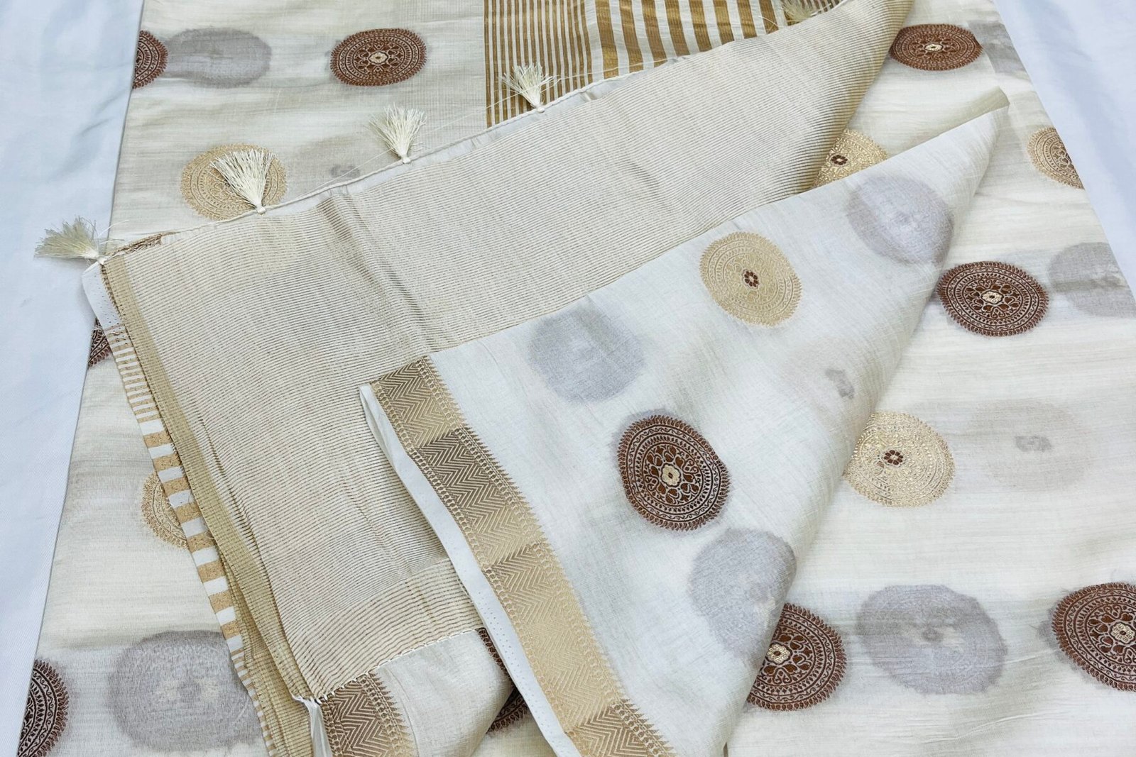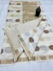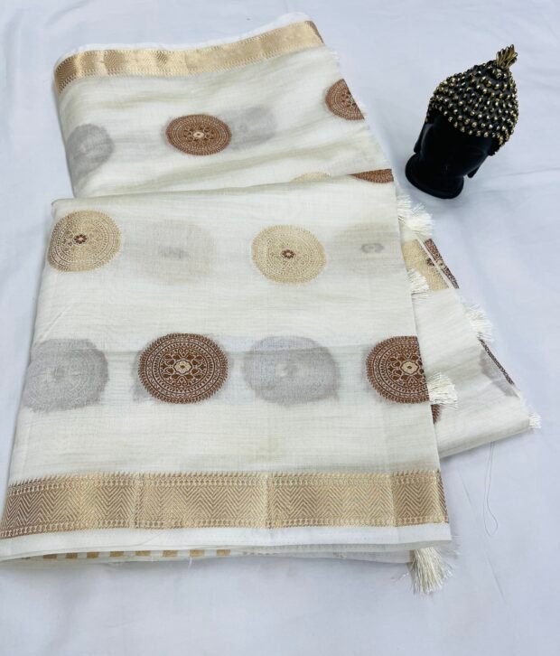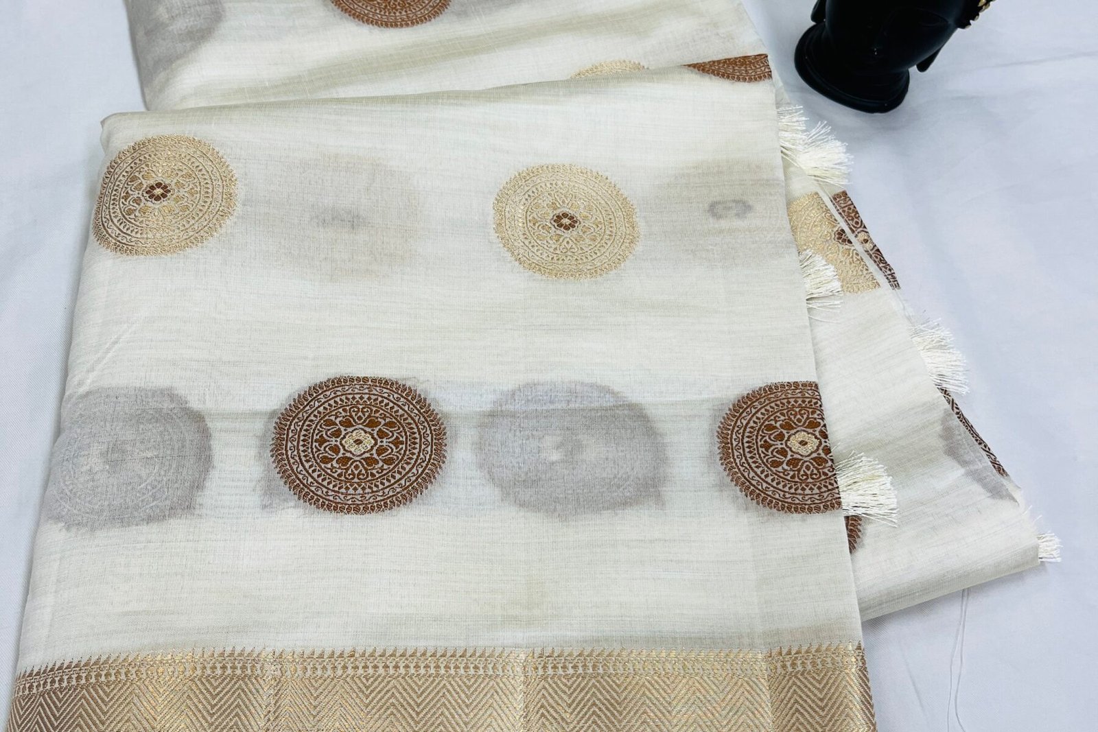 PEARL WHITE WITH CHAKRA ZARI &THREAD BUTTA AND SMALL WAVES  DEISGN ZARI WOVEN SELF BORDER FANCY ZARI PALLU WITH TISSUE LINES BLOUSE