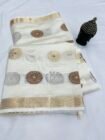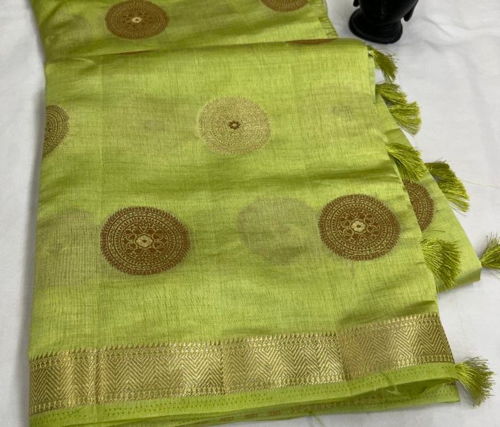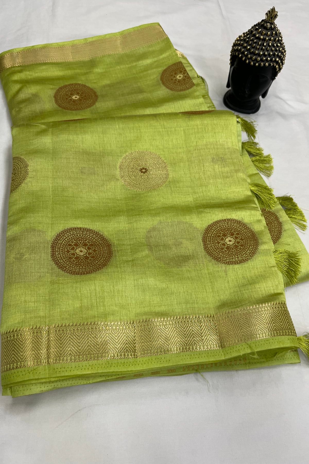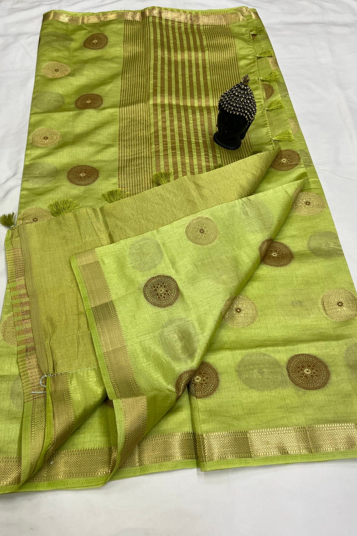 LIGHT PARROT GREEN SHADE WITH CHAKRA ZARI &THREAD BUTTA AND SMALL WAVES  DEISGN ZARI WOVEN SELF BORDER FANCY ZARI PALLU WITH TISSUE LINES BLOUSE